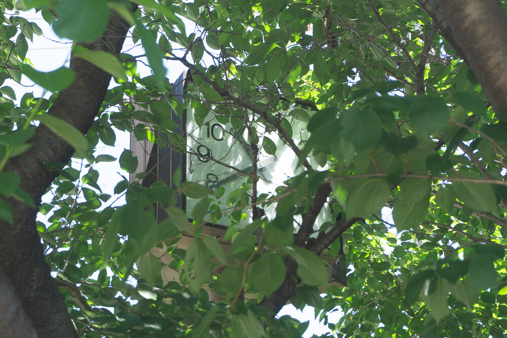 梅が枝住宅の給水塔前に時計があります。