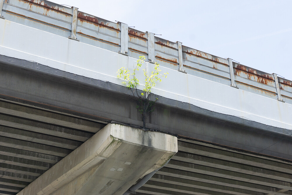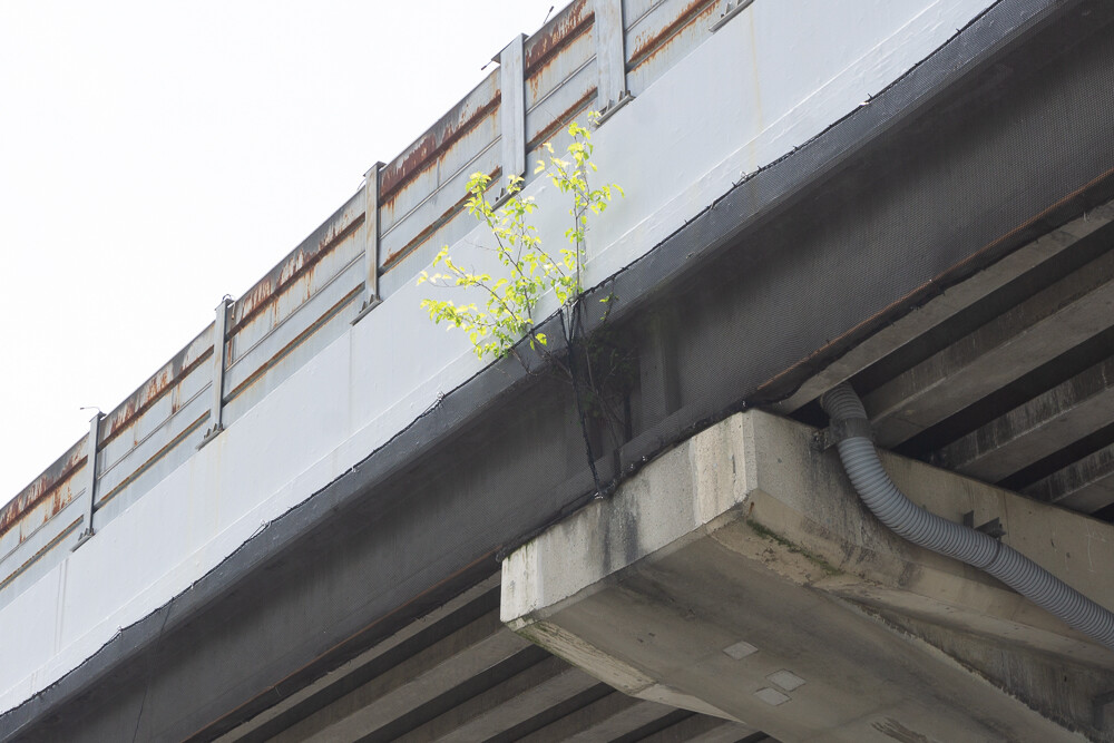 よく見ると、橋桁のすき間から生えた木が網の防御をすり抜けているようにも見えます。