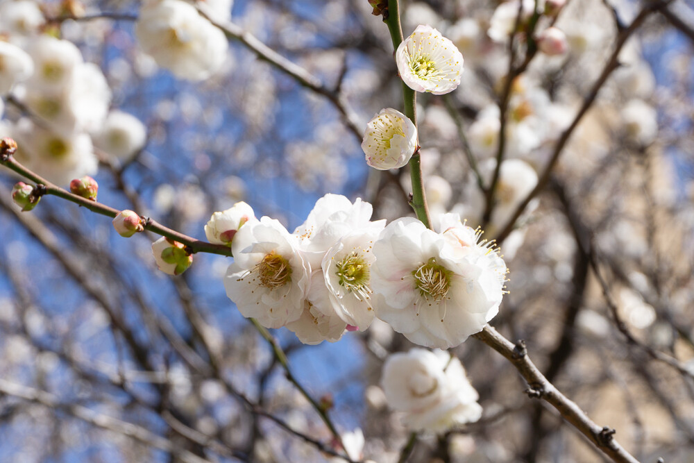 中には濃いピンク色の花も混じっています。この日は天気がよく、地名にもなっている梅の花と青空の組み合わせが最高でした。