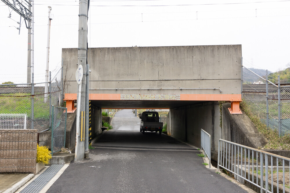田畑と住宅地が入り混じる私市1丁目の路地に突如現れる、こちらのガード。