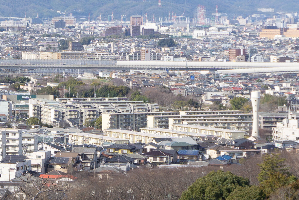 真ん中の奥には枚方市駅前で建設中の超高層ビル「ステーションヒル枚方」や、高槻市のクリーンセンターが見えています。更にその奥には新名神高速道路や北摂の山々が。