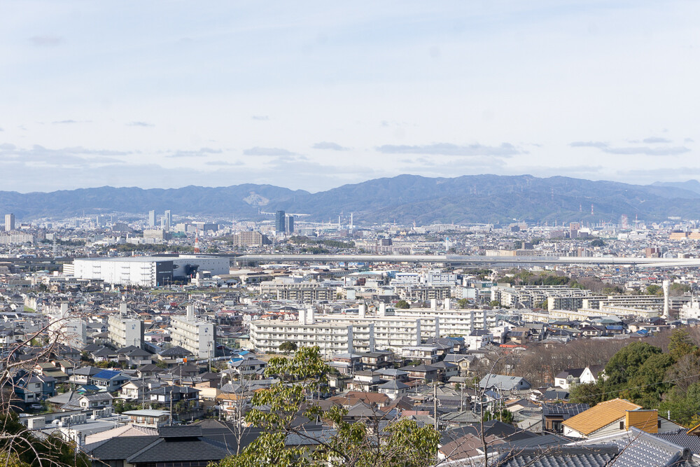 近くの妙見山は143.7mの高さがあり、妙見東の住宅地からも交野市内を一望できます。